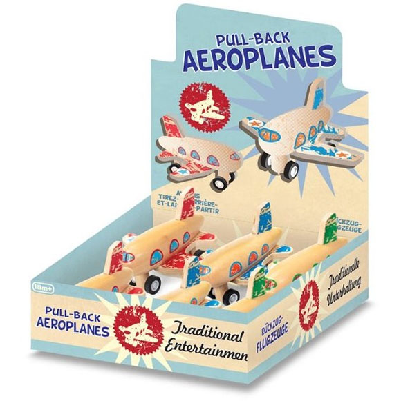 Painted wooden plane with four wheels and a pullback motor. Drag the plane back and then release it to send it rolling down any makeshift runway at full speed.